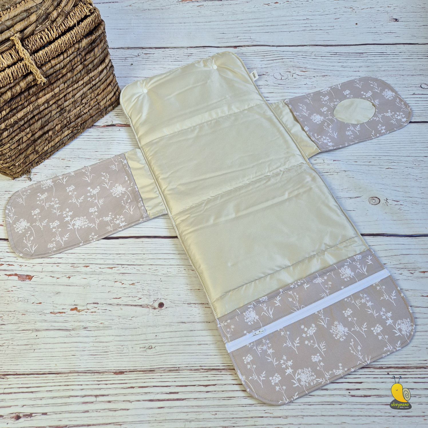 Anyaga prémium minőségű, Oeko Tex 100-as minősítésű pamutvászon, amit vetex-szel erősítettem. A pelenkázó alátét vízlepergetős a könnyebb tisztántartás érdekében. Mosógépben 30 fokon mosható, szükség szerint folttisztítható.